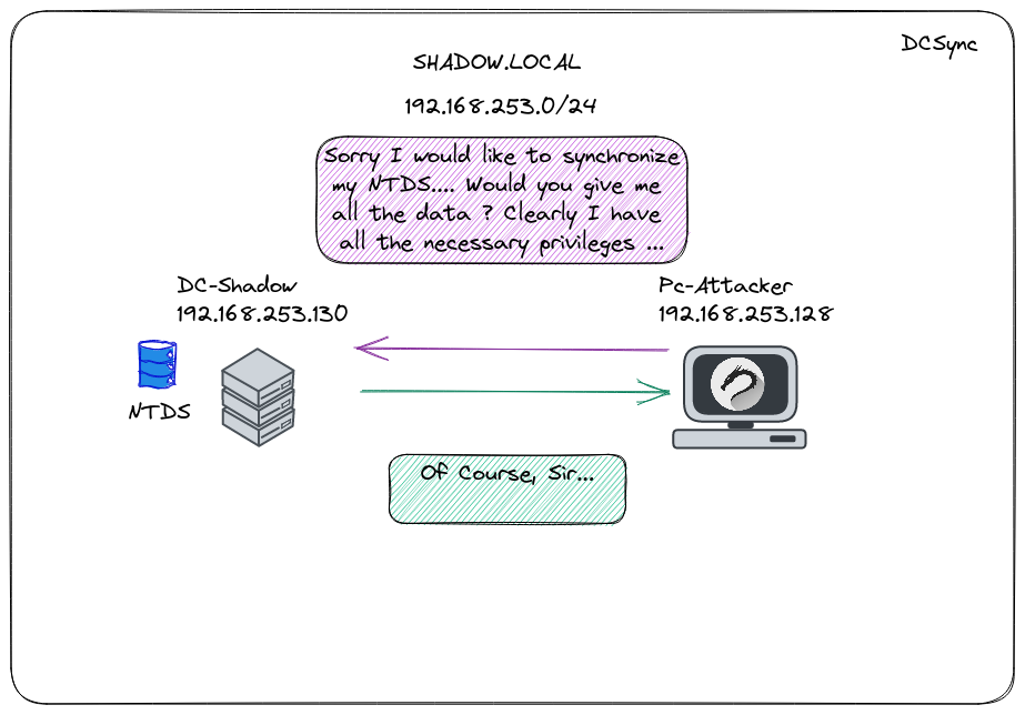 As we explored in the “Domain Controllers” section, each DC houses a synchronized copy of the NTDS, perpetually updated across all DCs to reflect changes. Leveraging this synchronization capability, the Dcsync technique empowers an attacker to pose as a DC, initiating requests to the Windows API for Active Directory synchronization and replication. Specifically, the DSGetNCChanges function within DRSUAPI plays a pivotal role in this Directory Replication Service (DRS) protocol.