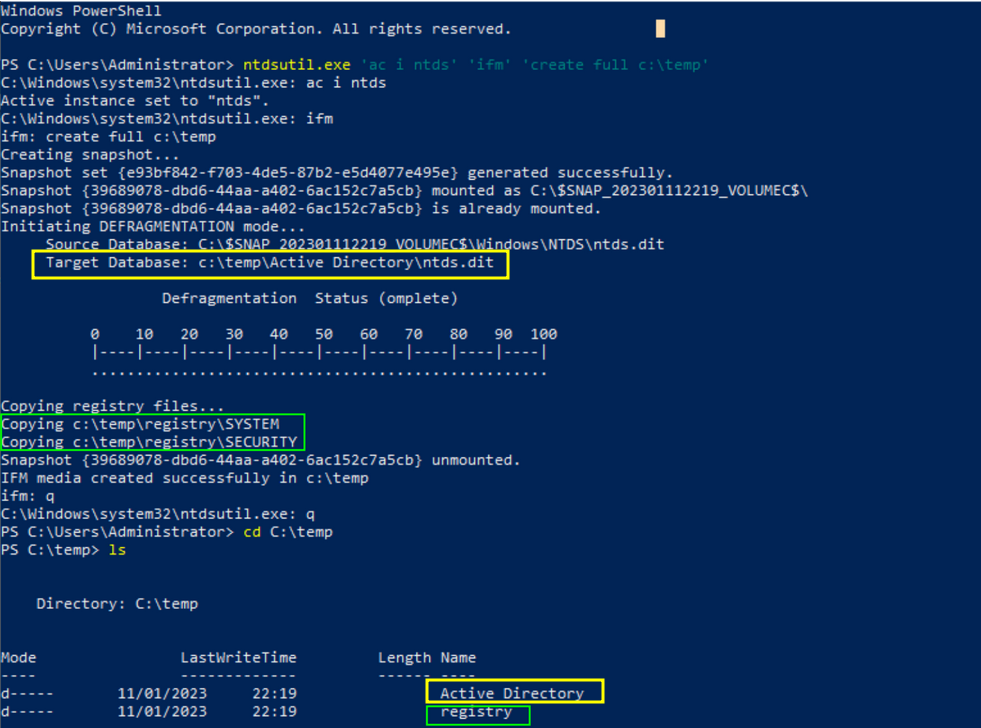 powershell "ntdsutil.exe 'ac i ntds' 'ifm' 'create full c:\temp' q q"