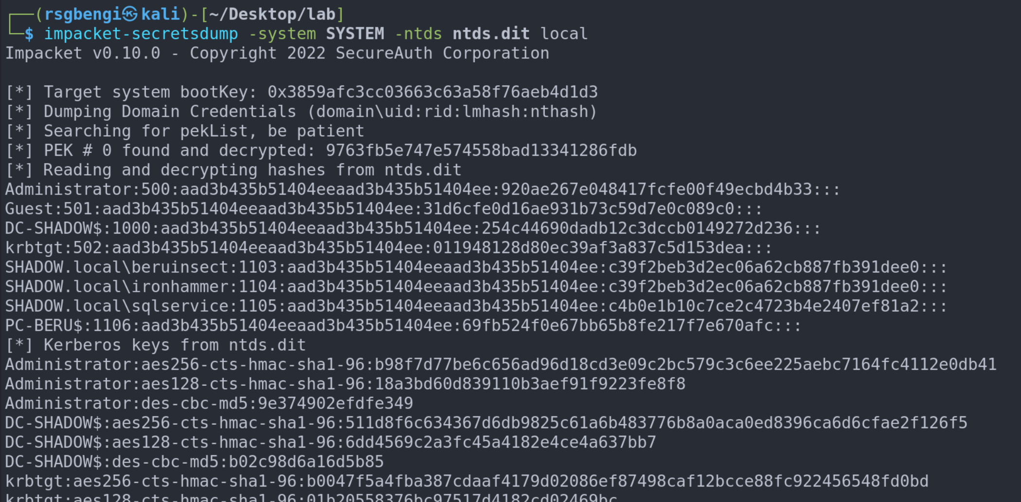 By employing the secretsdump script, we execute an NTDS dump with a focus on the SYSTEM hive. This strategic dump empowers us to harvest valuable information, including domain users, alongside their corresponding NTLM hashes and Kerberos keys.