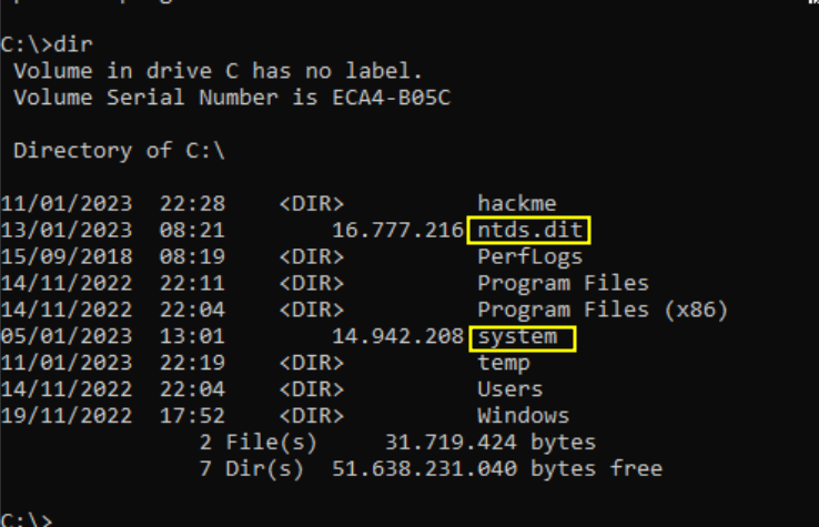 To duplicate the NTDS database through the Volume Shadow Copy service, we harness the functionalities of VSS—an ingenious service enabling the creation of backup copies of volumes even as applications actively engage with and write to them. For this task, Windows offers the vssadmin tool, a reliable ally in our data replication endeavors. Before embarking on the volume copy operation, it’s imperative to ensure the presence of the desired files. Typically, NTDS takes residence in “C:\Windows\NTDS\ntds.dit,” while the SYSTEM file finds its abode in “C:\Windows\System32\config\SYSTEM.”