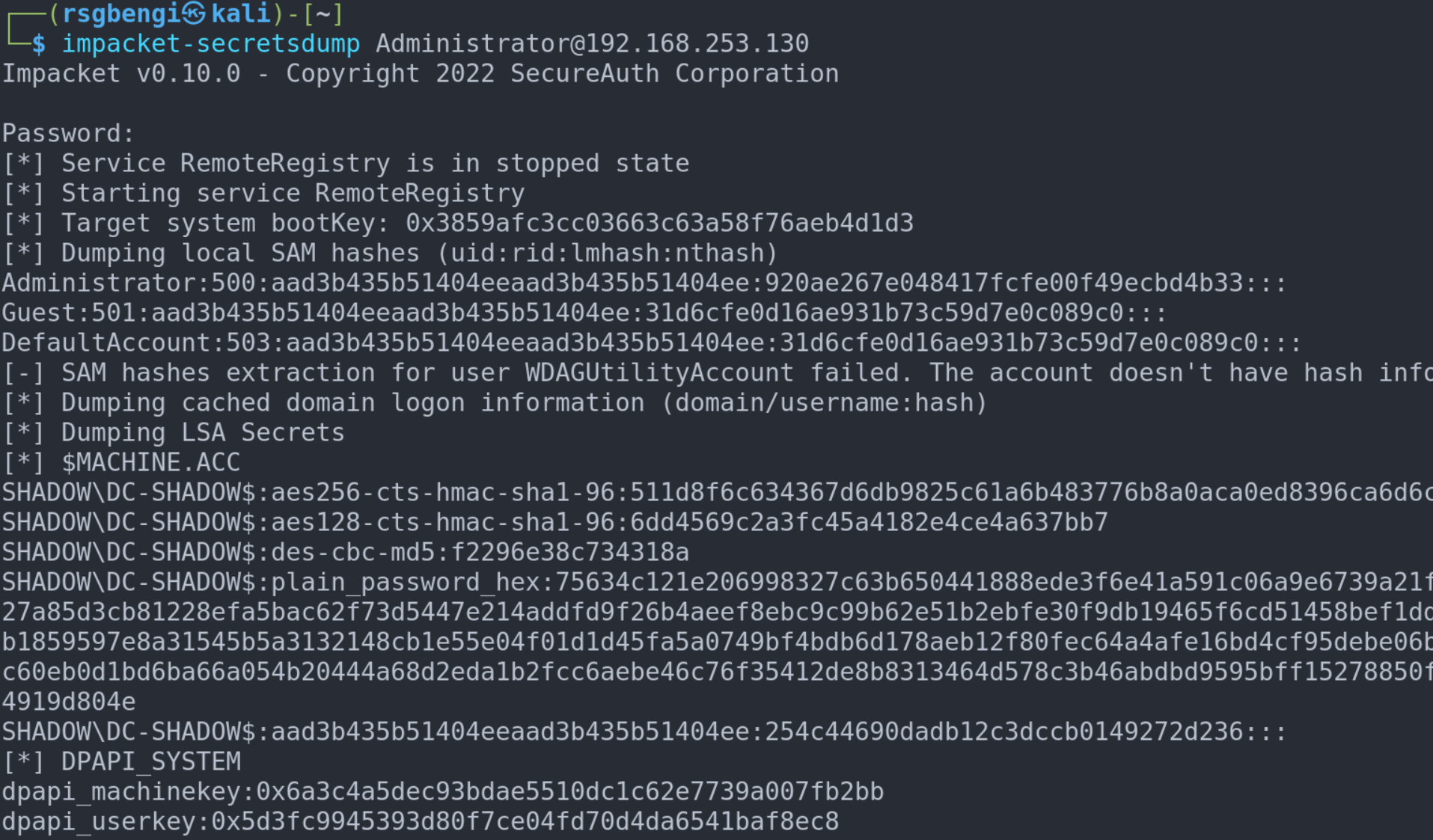 To employ this technique, the impacket’s secretsdump script becomes a valuable ally once again. What sets this script apart is its versatility—you don’t necessarily need a compromised Windows machine to execute it. Operating seamlessly from your Kali Linux, the secretsdump script unfolds a treasure trove of critical information. Fear not if the intricacies seem daunting at first; we’ll delve into each facet in due course: