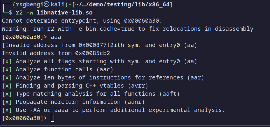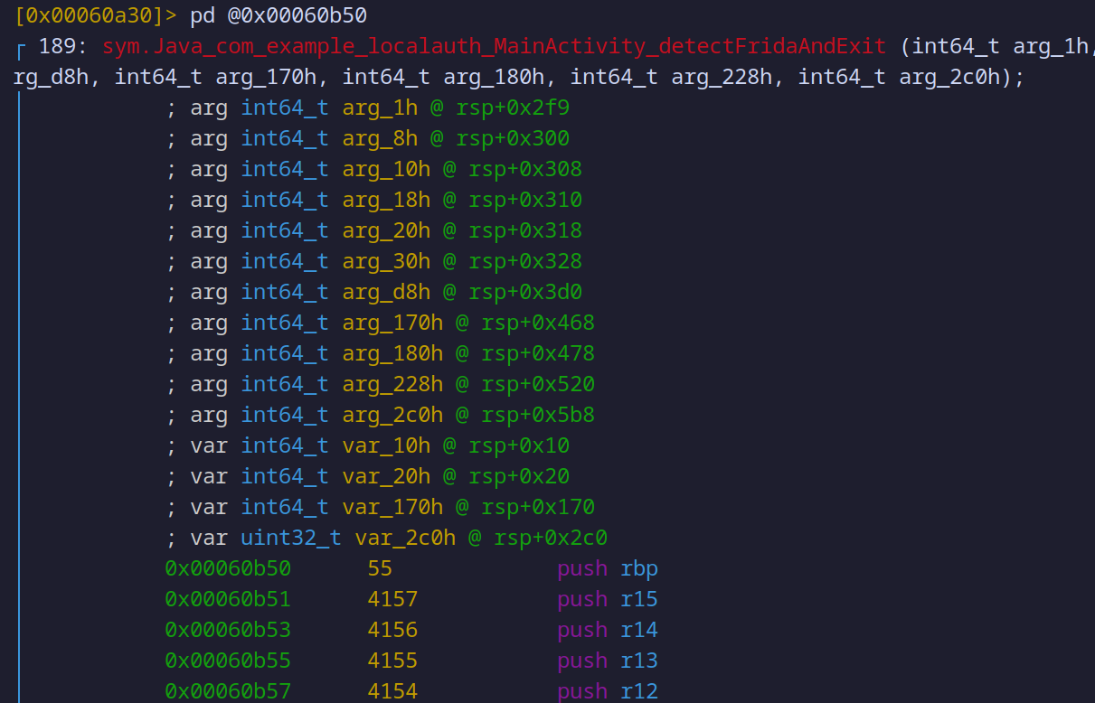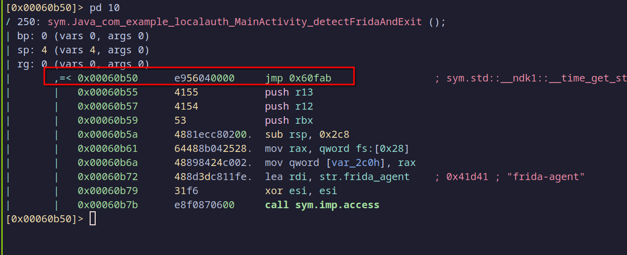 This command tells Radare2 to add a jmp instruction to 0x60fab, which is where the function naturally returns. As a result, when detectFridaAndExit is called, it will skip all Frida detection code and go directly to the end.