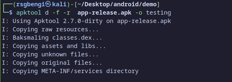 Here, testing is the directory where we previously decompiled the APK, and app-cracked.apk is the name of the rebuilt APK. This command packages the APK with our modified native library, creating an APK file that’s ready for the next steps.
