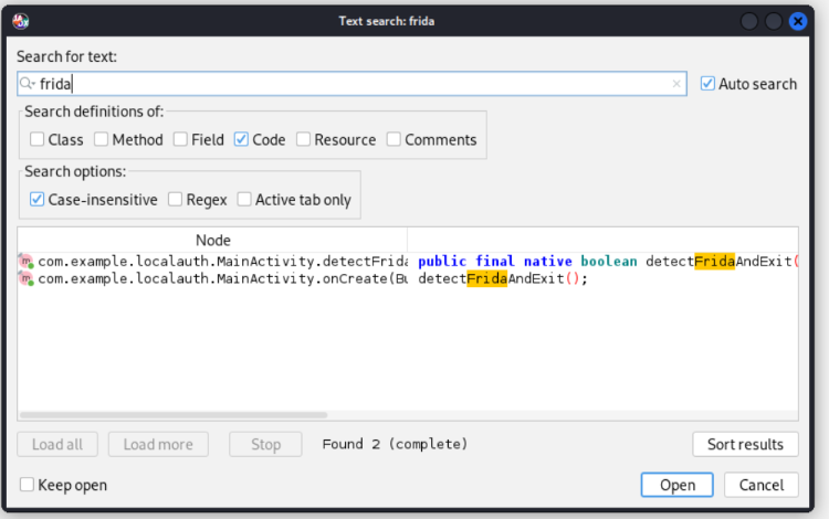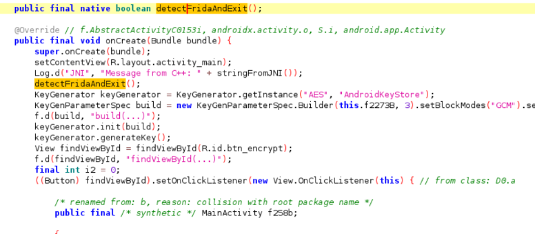 In this example, we’ll integrate the Frida detection function at the start of onCreate in MainActivity to immediately check for Frida when the app launches. In a real-world scenario, however, the detection code could be spread across multiple activities, with obfuscated names, making it harder to detect and bypass. For the sake of this example, though, we’ll keep it simple by placing the detection code at the beginning of onCreate in a single location. This setup will ensure that if Frida is detected, the app terminates before fully loading.