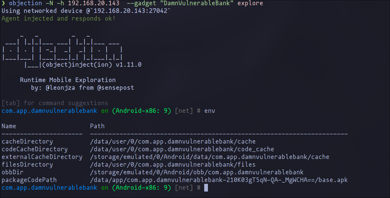 As we explored in the previous chapter, the Objection tool is a powerful asset for assessing the security of mobile applications. Running the env command in Objection provides valuable information about various directories used by the application under analysis. Here, we break down the output obtained for the com.app.damnvulnerablebank application on an Android device:
