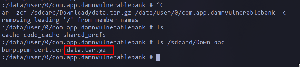tar -zcf /sdcard/Download/data.tar.gz /data/user/0/com.app.damnvulnerablebak