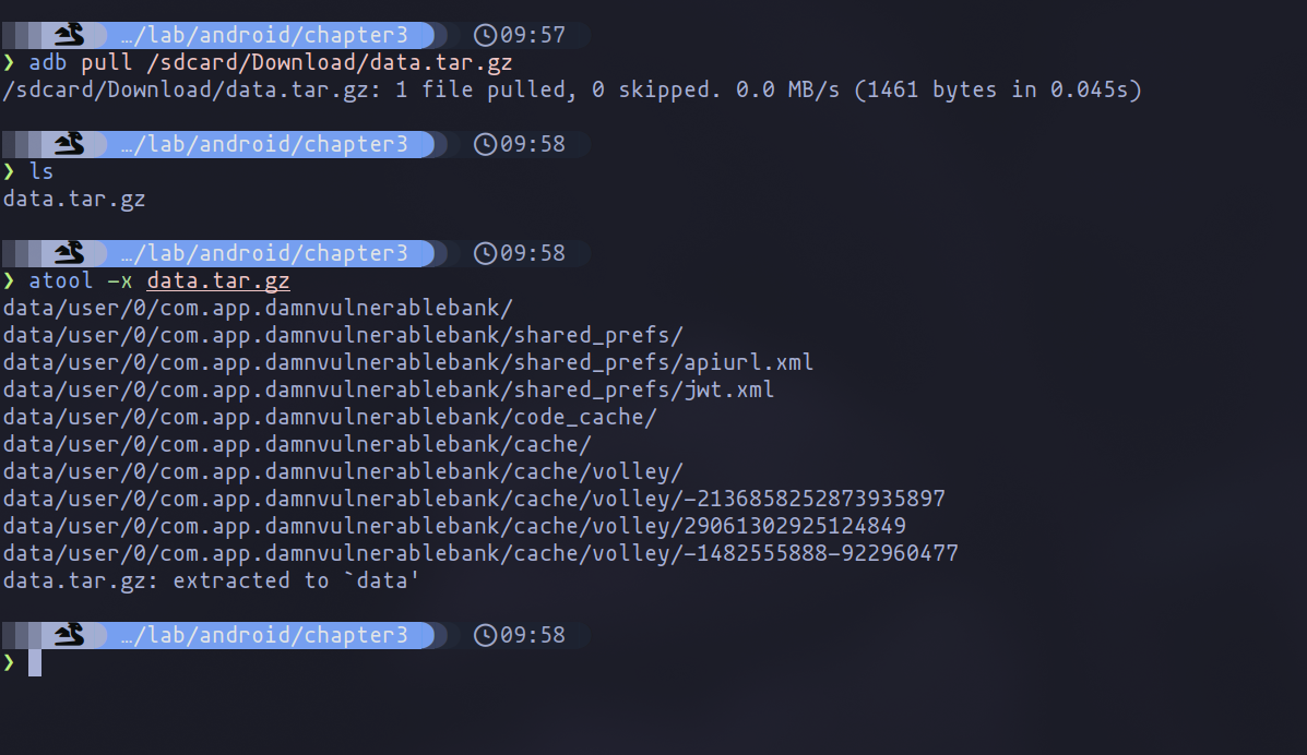 After creating the compressed file containing all the data, we can download it using adb and the pull command. Subsequently, we can extract the contents using tools such as atool or tar.