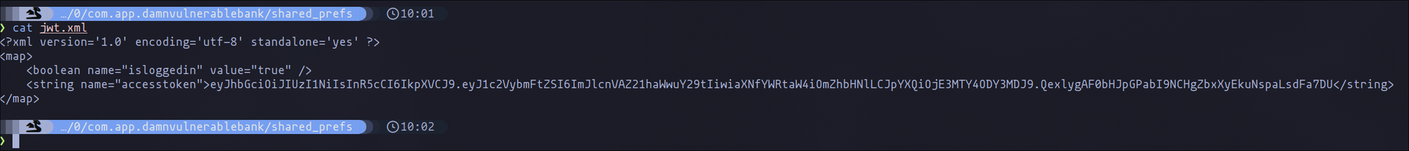 Upon examining the file’s contents, we immediately notice the presence of the application’s authorization token (JWT). This poses a significant security risk, as sensitive information of this nature should be securely stored to prevent unauthorized access by malicious individuals. In a real-world scenario, such as with a banking application, unauthorized access to a JWT could potentially lead to the exposure of sensitive user data.
