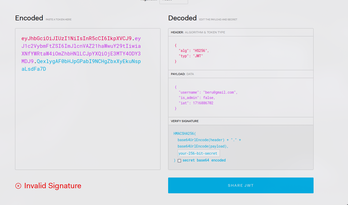 As shown in the image above, jwt.io allows us to clearly view all the data contained in the JWT, including the username and admin status of the user.