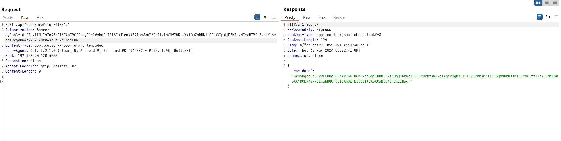 For example, if we intercept traffic using BurpSuite when accessing the user profile, we can observe how the JWT is used to authorize the user and retrieve their corresponding data, such as username and account number. This is visible thanks to the interface, but the response of the request only shows data that appears to be encrypted. Therefore, we rely on the user interface to view the data sent and received for the user.