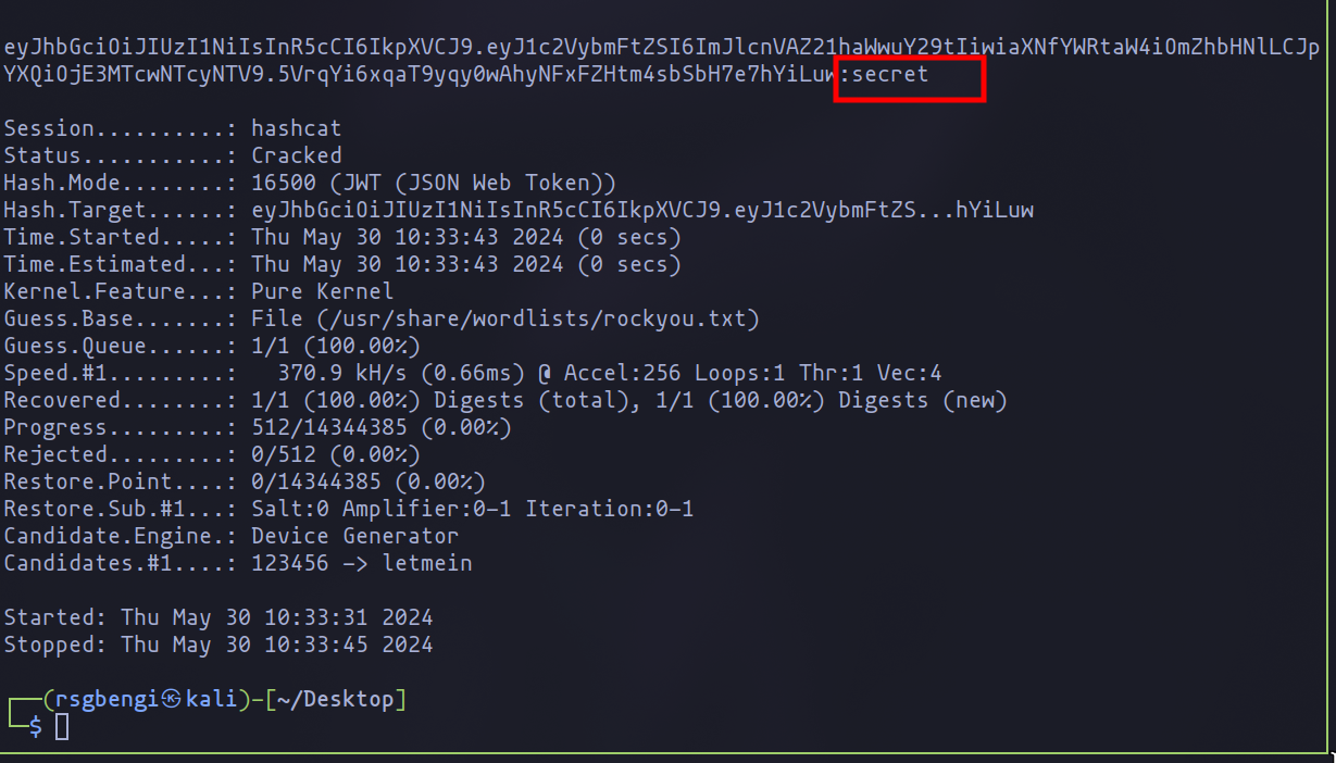 In this scenario, the JWT was successfully cracked, revealing that the secret used to sign the JWT is “secret.” With this knowledge, the authorization system of the application has been compromised.