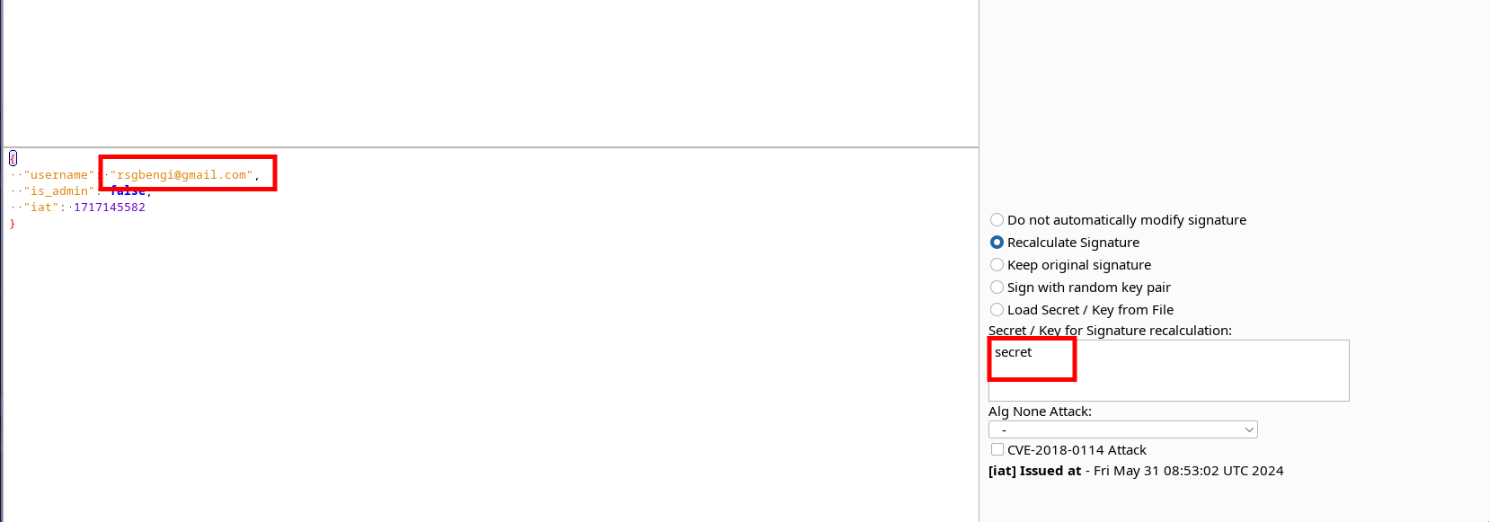 By modifying the JWT using BurpSuite plugins like JSON Web Tokens, we can attempt to change the username and re-sign the token with the correct password. This allows us to potentially impersonate another user (in this we will try to impersonate the user rsgbengi).