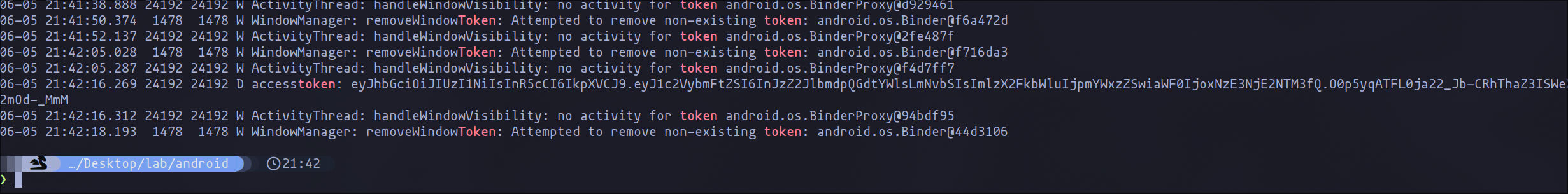 This command will create a file with all the logs generated by the Android device. We can then analyze this file to detect sensitive information, such as the JWT. Additionally, if we know that the application uses card numbers or similar sensitive data, we can look for this type of information in the logs as well.