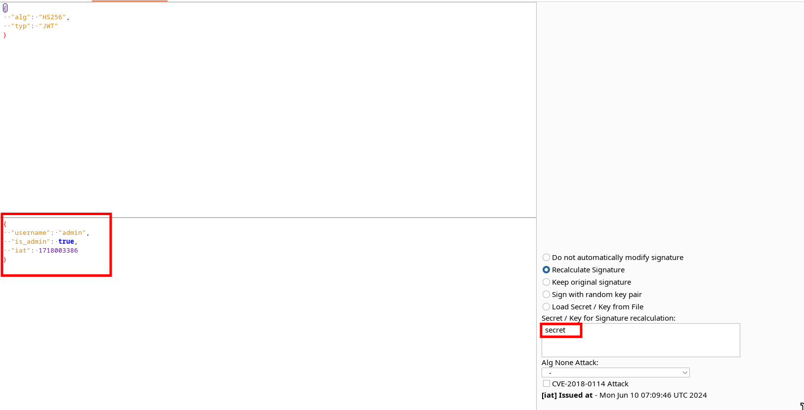 This application has a default admin user, so we can also try to find out their data. By changing the JWT username from "rsgbengi@gmail.com" to "admin" and setting "is_admin" to "true", we can impersonate the admin user.