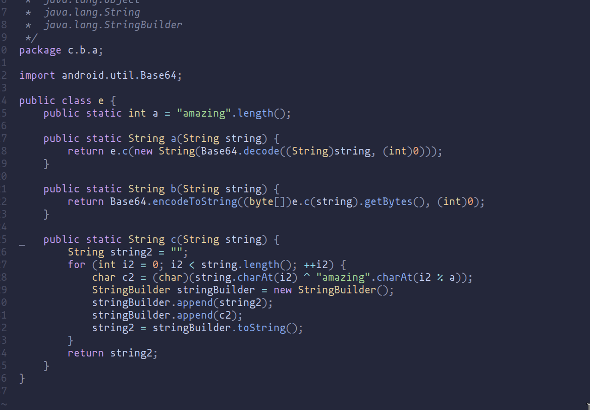 amethod: Decodes a Base64 encoded string and then obfuscates it.bmethod: Obfuscates a string and then encodes it in Base64.cmethod: Obfuscates a string using a simple XOR-based technique.