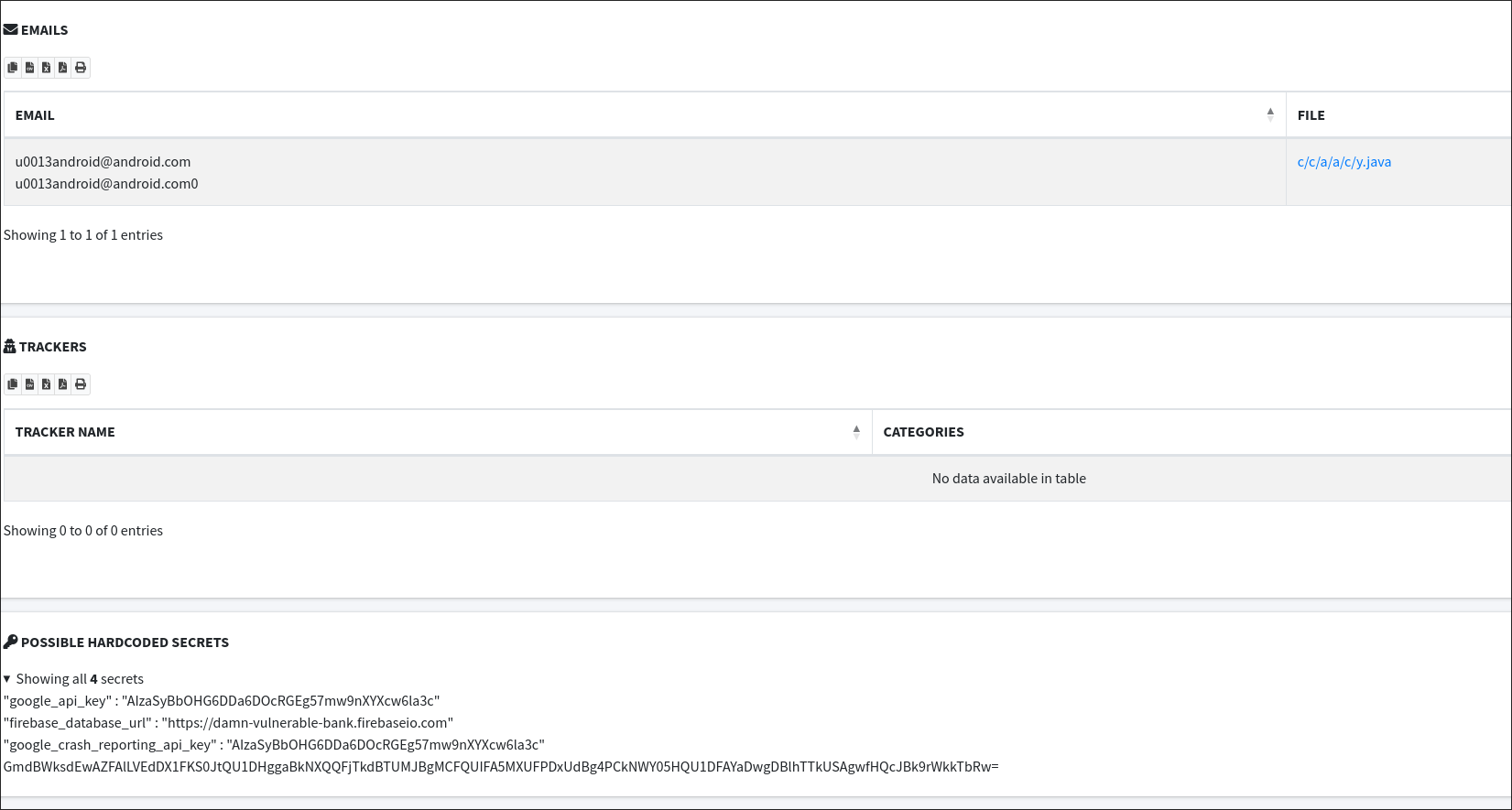 - Hardcoded Secrets: This part of the report identifies any hardcoded secrets within the application, such as API keys, passwords, and tokens. These can be critical security issues as they might provide attackers with direct access to backend systems or services.