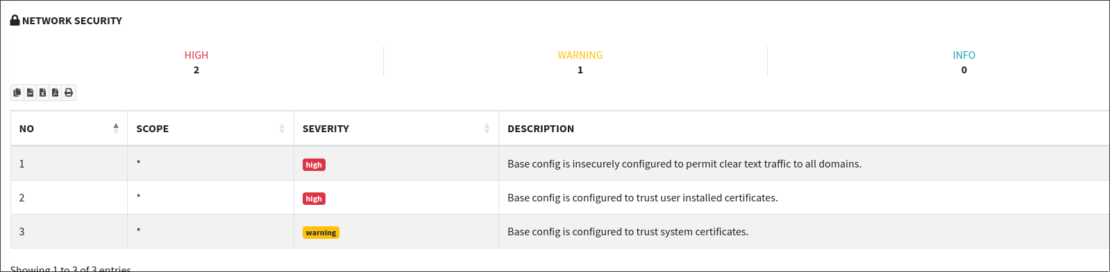 - Network Configuration Analysis: This tab reviews the security of the application’s network communications. Similar to tools like Testssl for web applications, it assesses HTTPS implementation and other network security practices. Here, you can identify issues such as weak SSL/TLS configurations, insecure transmission of data, and other network-related vulnerabilities.