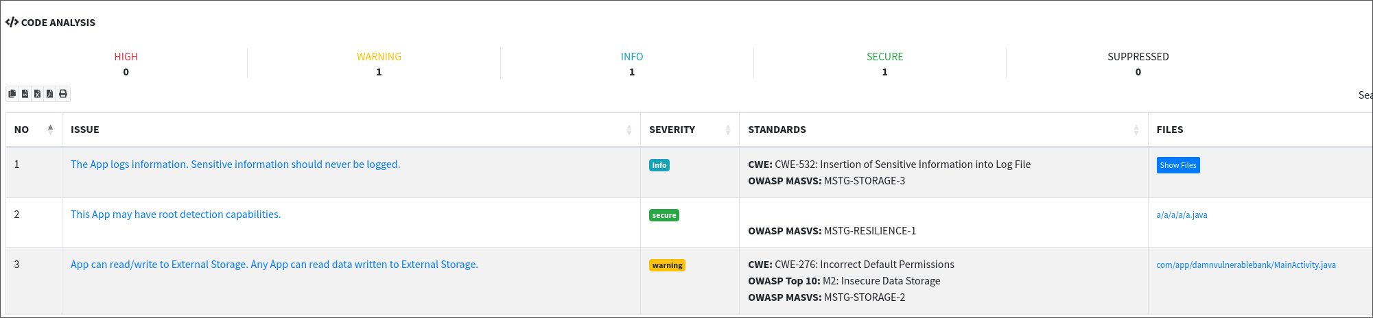 - Code Analysis: This tab delves into the source code, identifying insecure coding practices and potential vulnerabilities such as hardcoded credentials, insecure data handling, and possible SQL injection points. Code analysis often uncovers subtle issues that might not be apparent in other sections.