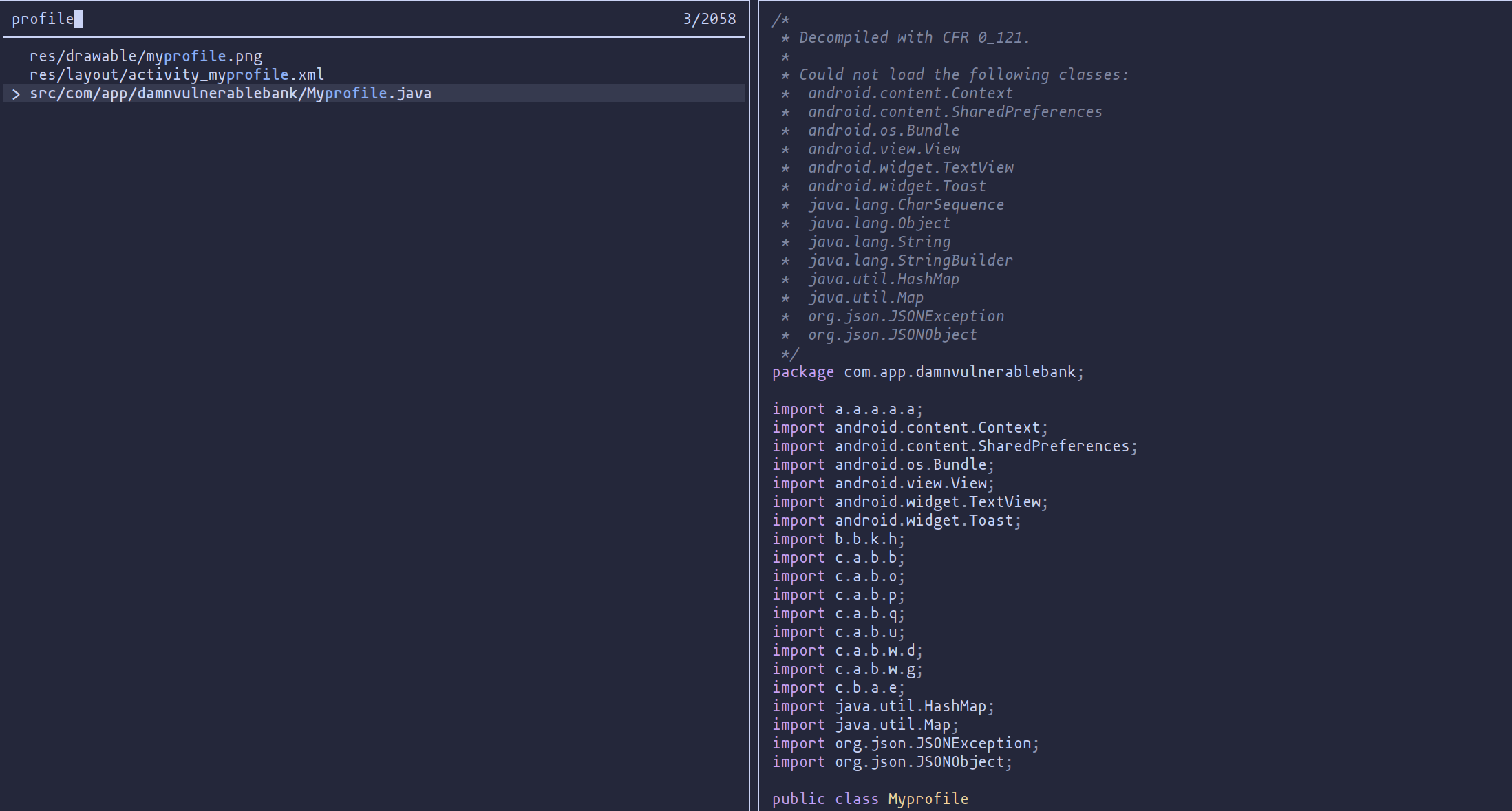 After obtaining the code, we need to search for the Profile class to try to understand what is happening.