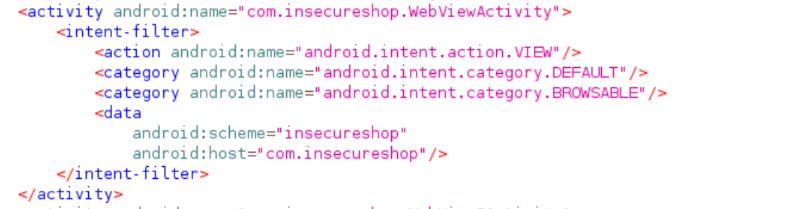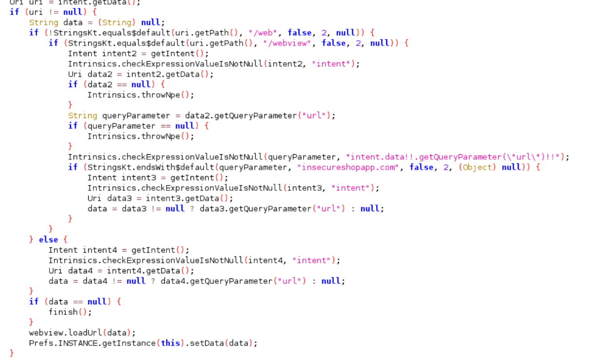 String deeplinkUrl = "insecureshop://com.insecureshop/web?url=https://malicious-site.com";