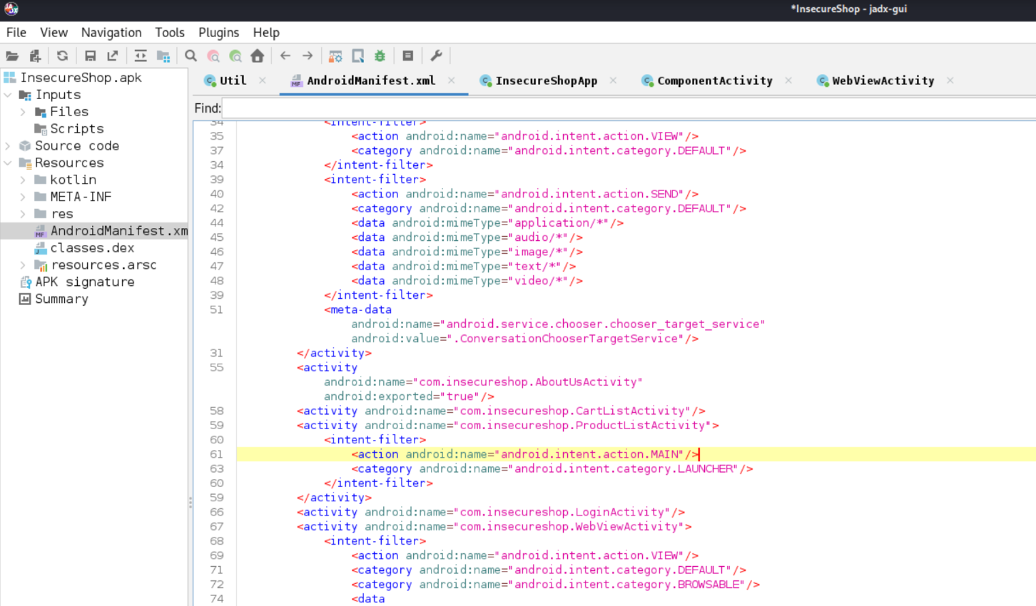 AndroidManifest.xmlfile to define which activities to open. - Detecting Vulnerabilities: Use static and dynamic analysis to identify broad configurations and improper data handling.