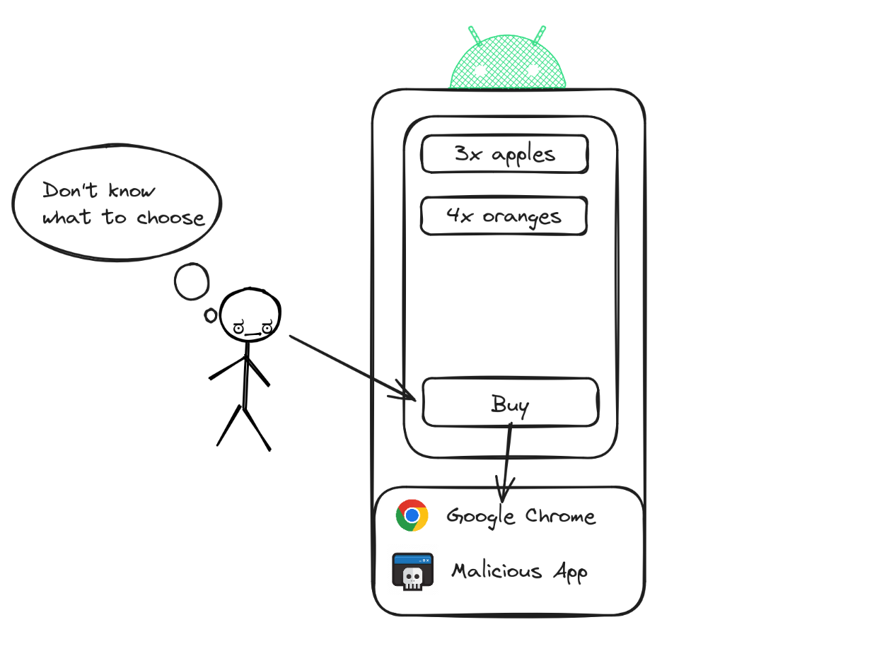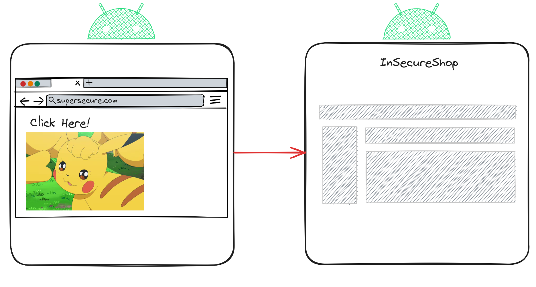 This Proof of Concept (PoC) demonstrates how to exploit the vulnerability using an open redirect attack. However, there are other types of attacks that can also be performed. For instance, an attacker could create another mobile application designed to launch the vulnerable activity in the insecureShop app. This type of attack is known as a “Cross-App” attack and operates in a similar manner.