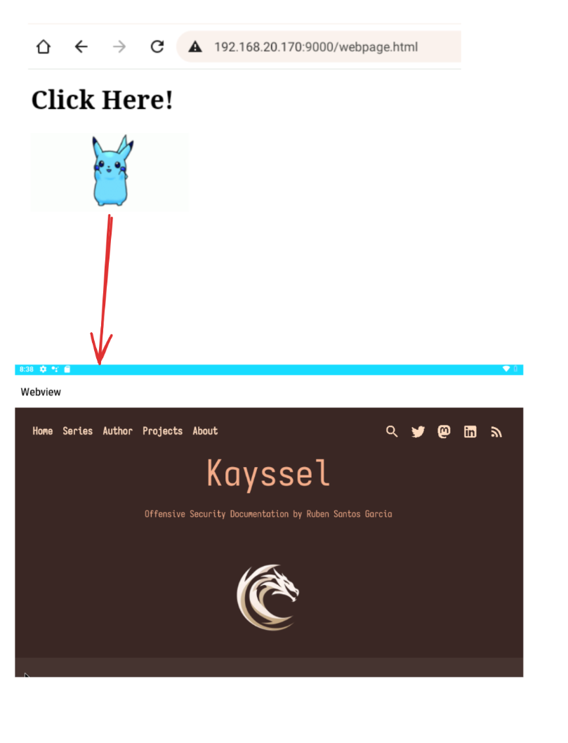 In this example, the a tag contains a link with a custom URI scheme (insecureshop://) that is intended to trigger the InsecureShop application. The url parameter points to the malicious site (https://kayssel.com). When a user clicks the Pikachu GIF, they will be redirected to this URL within the InsecureShop app, demonstrating how an open redirect can be exploited to direct users to potentially harmful sites.