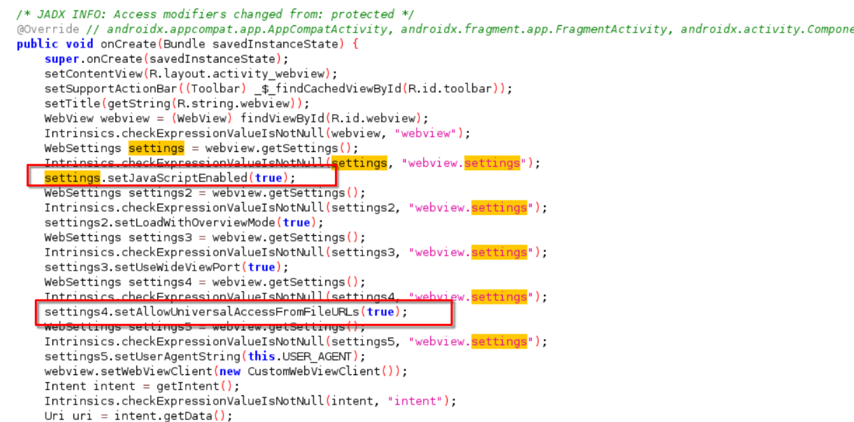 setJavaScriptEnabled(true)) allows for interactive features and enhanced functionality in web content. However, it also opens up the risk of Cross-Site Scripting (XSS) attacks if not properly managed. - setAllowUniversalAccessFromFileURLs: This setting controls whether JavaScript running in a file URL context can access content from any origin, including other file URLs or remote servers. While it can be useful for certain functionalities, enabling this setting (
