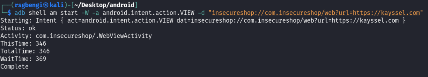 adb shell am start -W -a android.intent.action.VIEW -d "insecureshop://com.insecureshop/web?url=https://kayssel.com"