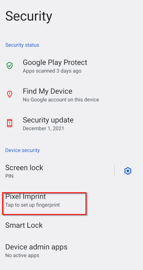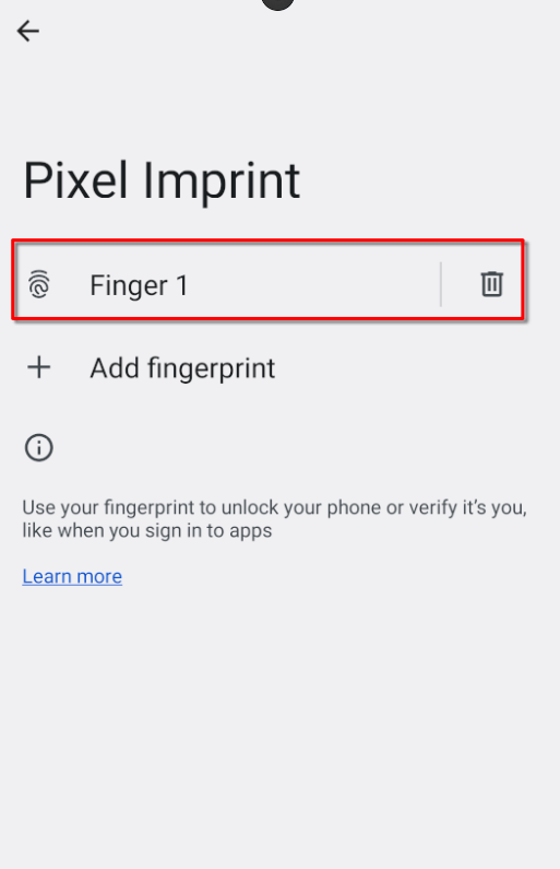 After successfully registering the fingerprint, you should see it listed under Pixel Imprint in the security settings.