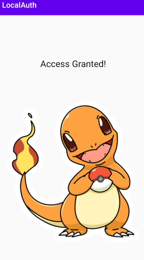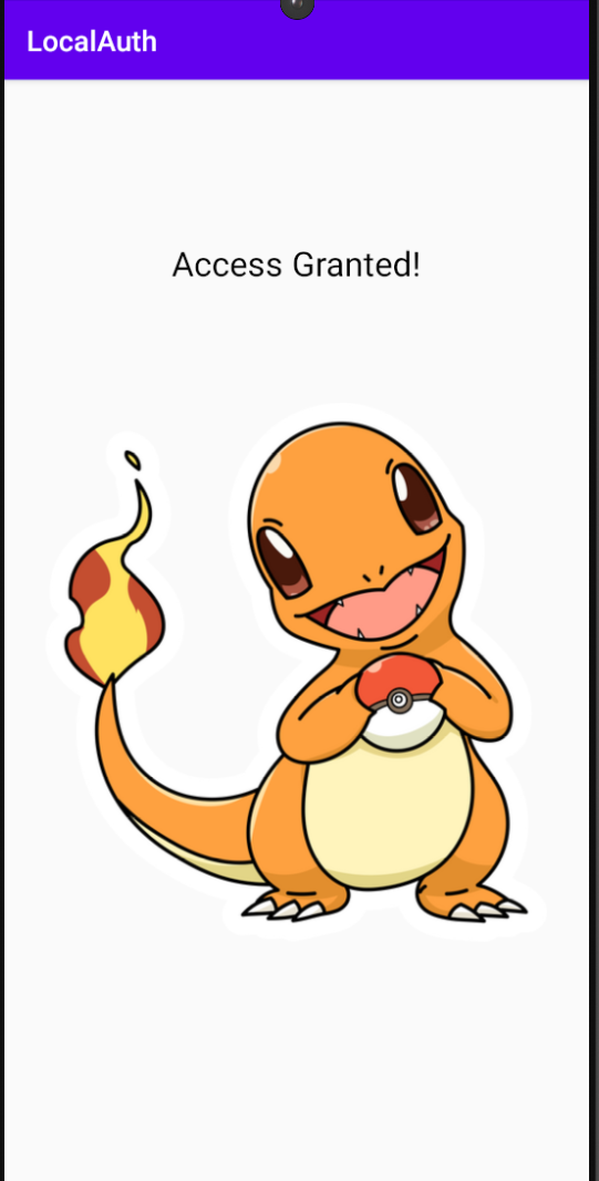 If the correct fingerprint is provided, you’ll successfully authenticate and be taken to the second screen, which features a cheerful Charmander! 😆