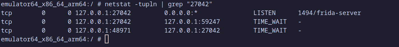 If everything is set up correctly, you should see the Frida server running on port 27042. To verify this, run the following command: