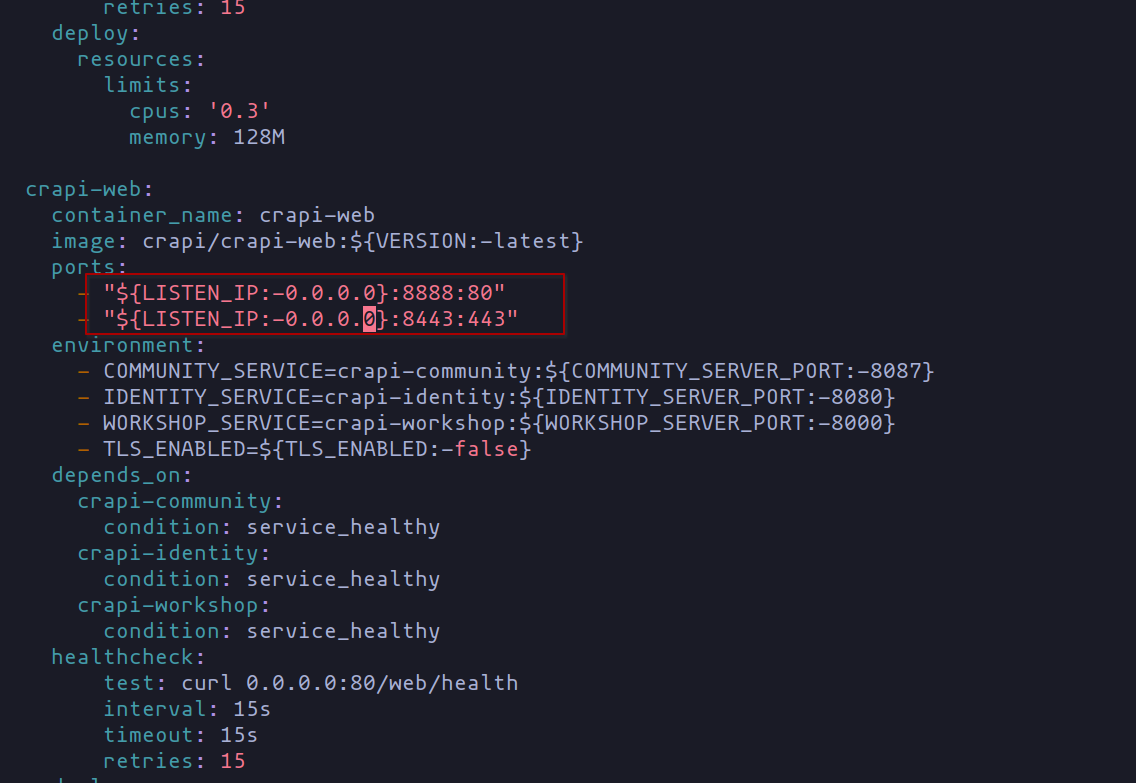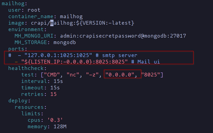 If you’re sticking with the local setup, no worries; no adjustments are needed in the docker-compose.yml file. However, if you opt for a virtual machine setup (perhaps using Proxmox), a few tweaks are necessary. Navigate to the “ports” section and replace “127.0.0.1” with “0.0.0.0” to allow requests from all network interfaces. Check out the screenshots below for a sneak peek.