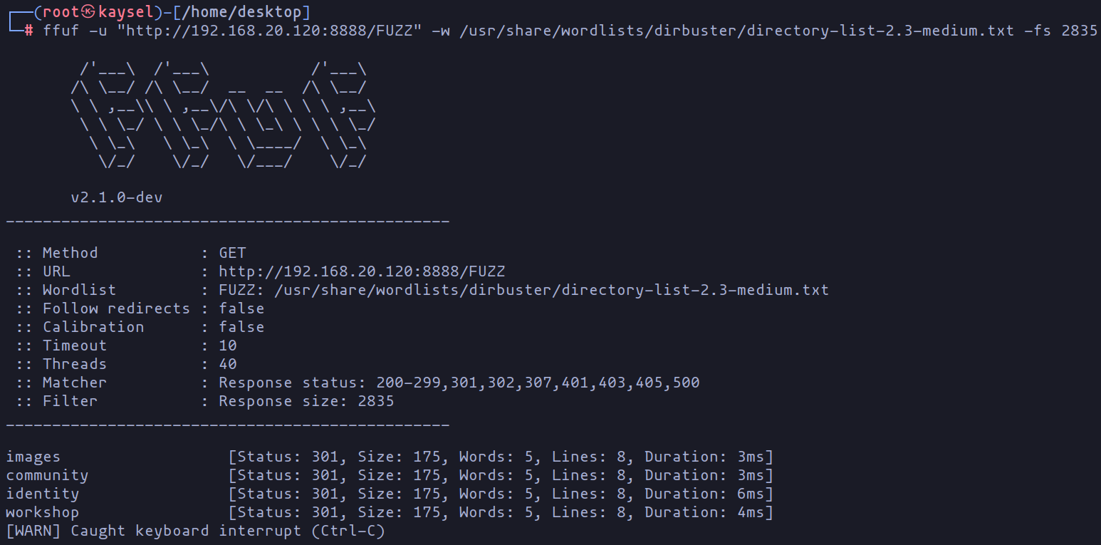 ffuf -u "http://192.168.20.120:8888/FUZZ" -w /usr/share/wordlists/dirbuster/directory-list-2.3-medium.txt -fs 2835