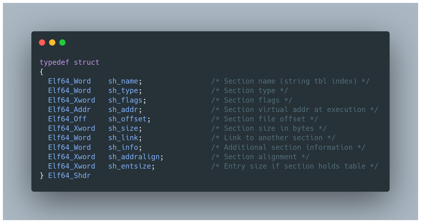- Section Headers: Each section is described by what is known as a section header. These headers collectively form the section header table. Although we won’t delve deeply into each header part, it’s important to note that their definitions can be found in