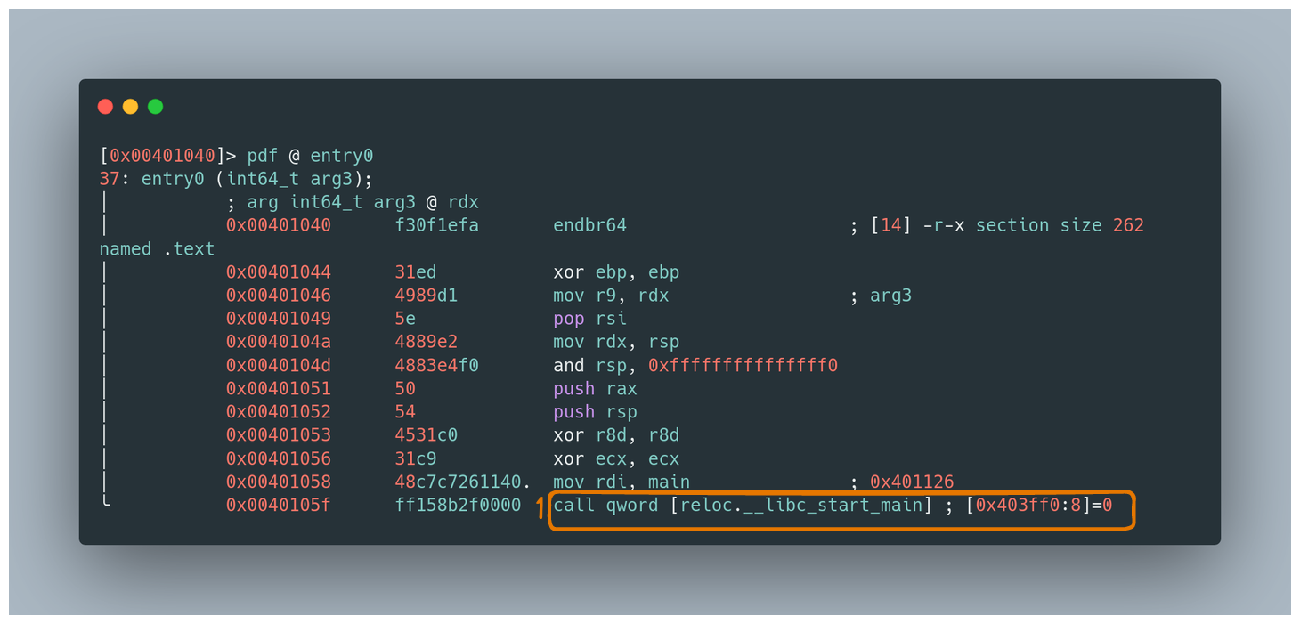 entry0Function: Commonly known as__startin other tools,entry0is a standard function in ELF binaries compiled with gcc. Its primary role is to set up command line arguments and the environment for executing themainfunction. The assembly code forentry0typically shows it callinglibc_start_main, which then callsmainwith the appropriate arguments.
