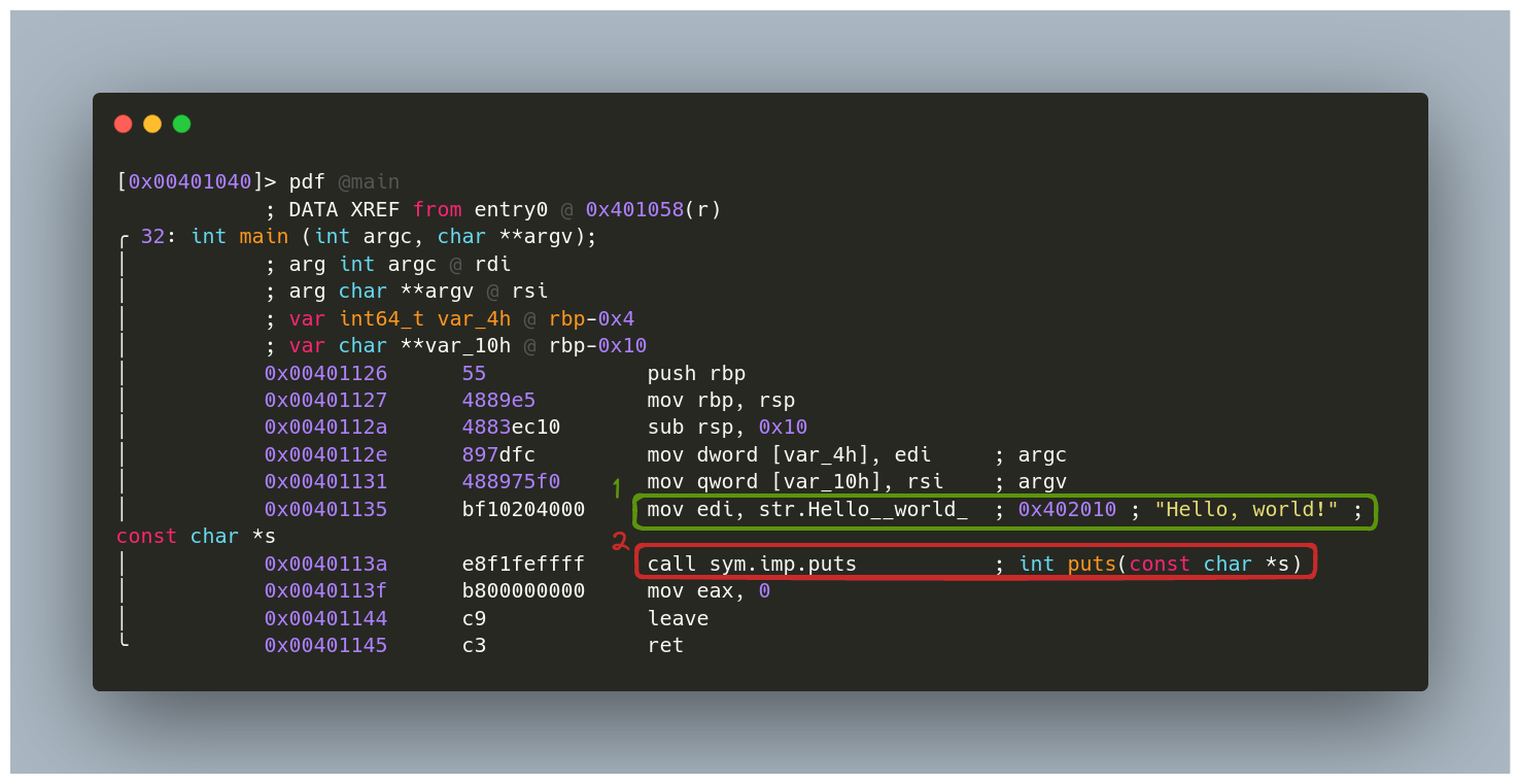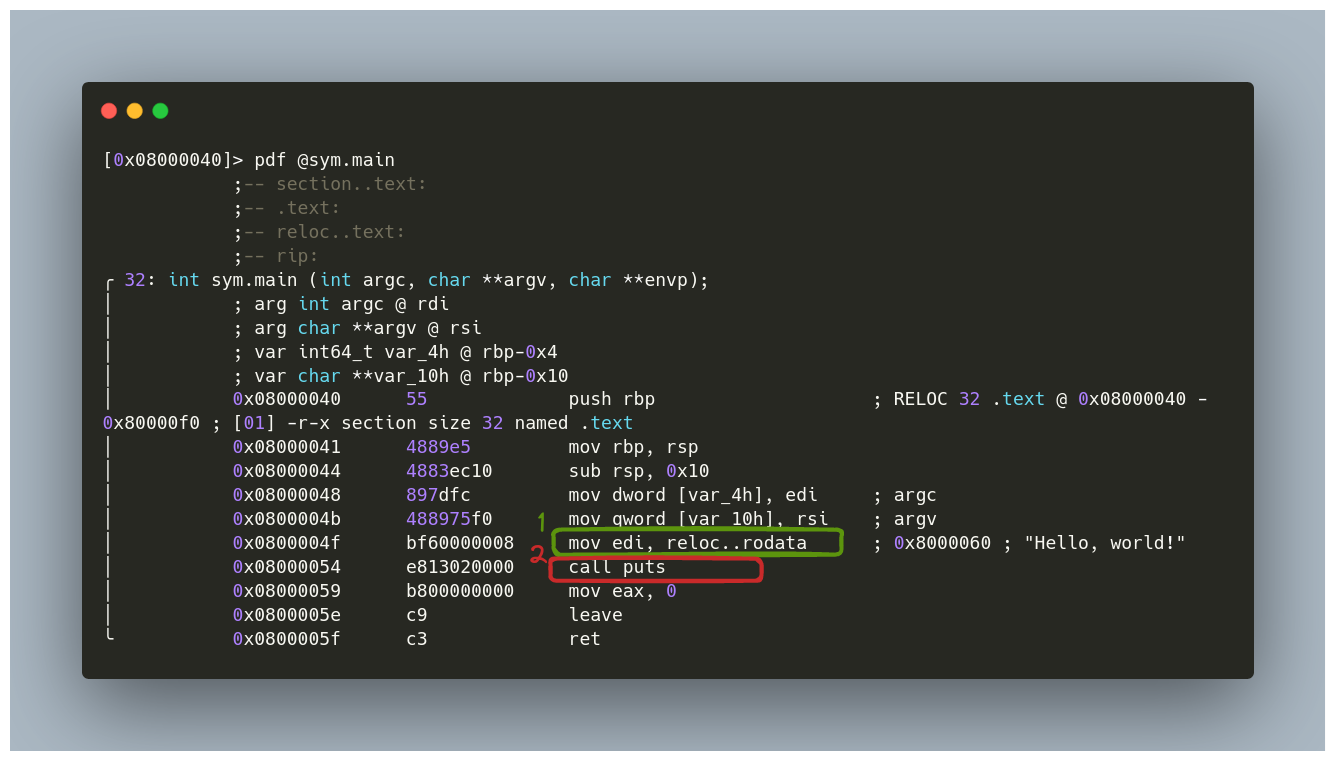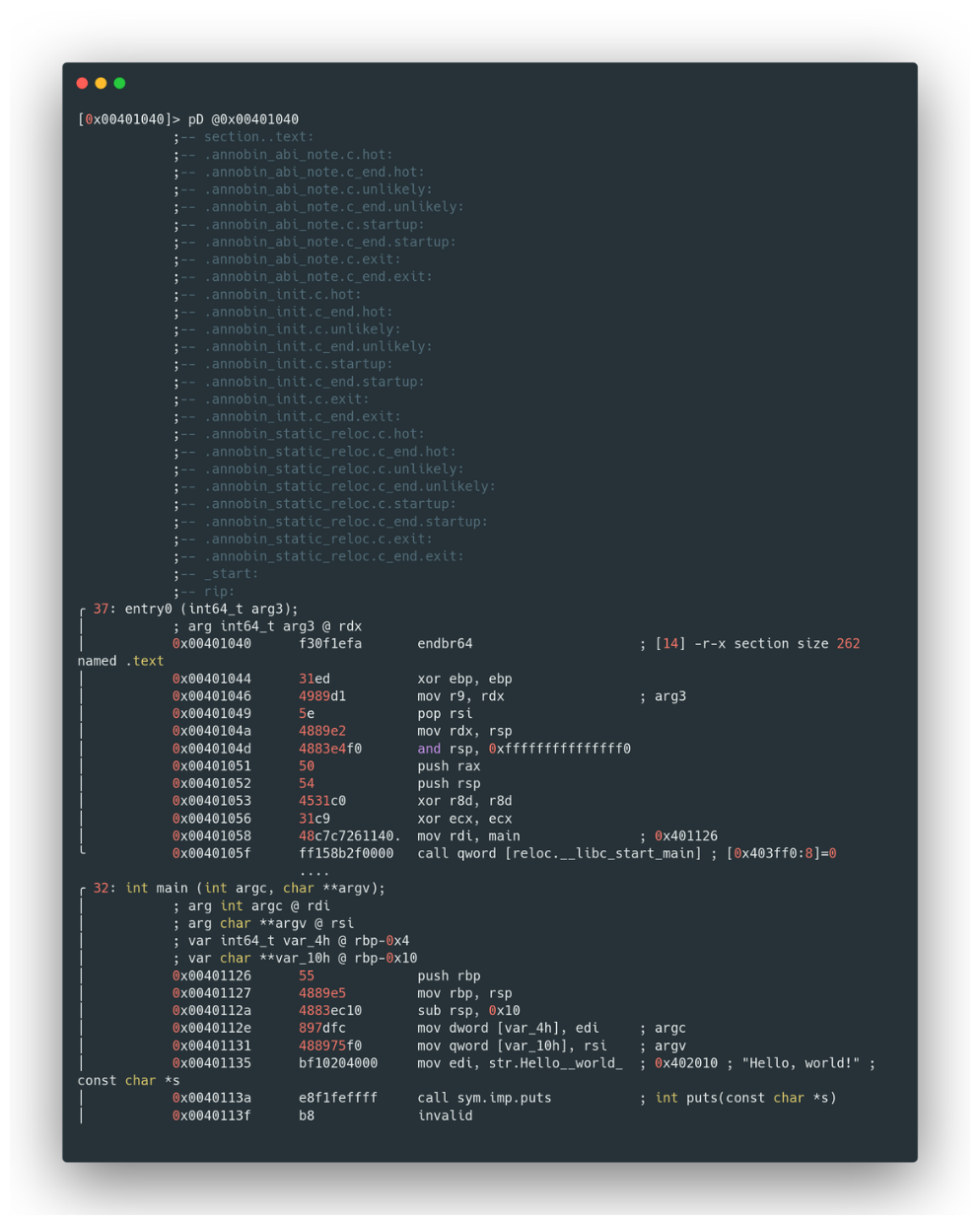 - Relocation of Strings: The need for string relocation, as seen in object files, no longer exists. Radare2 can now directly locate the memory address of the string “Hello, world!” at