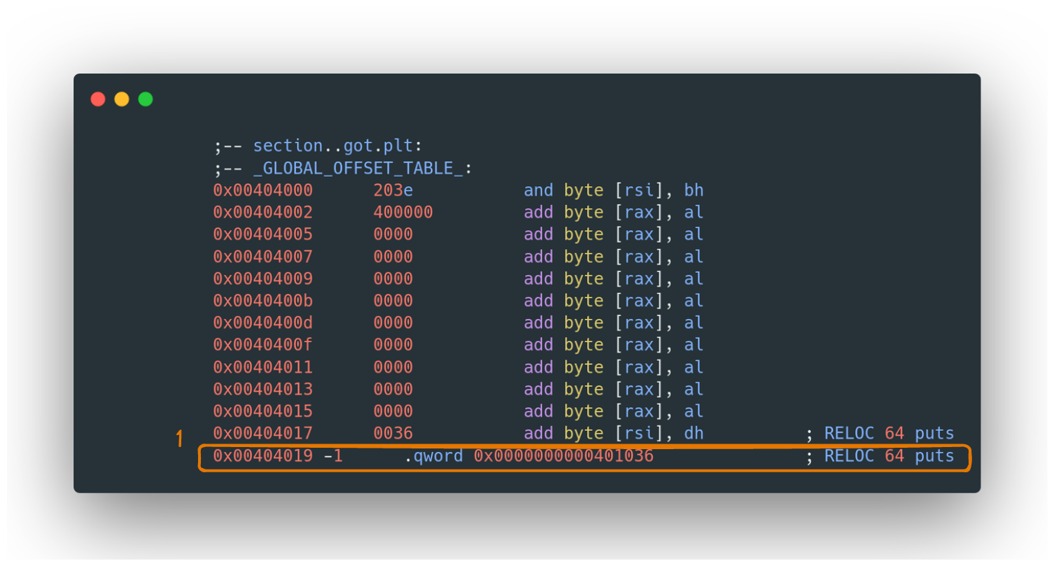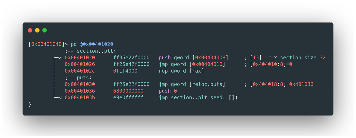 iSto show sections andpD <address>to display content can be used, similar to analyzing the .text section. - Global Offset Table (GOT): The GOT holds memory addresses where dynamically linked functions will be placed. Initially, these addresses point back to the PLT, due to the lazy binding process not being complete.