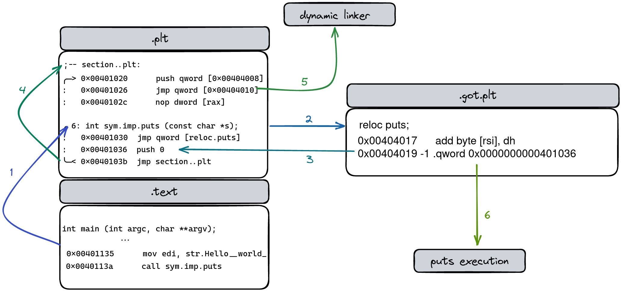 puts. This triggers the sequence in the PLT. - PLT-GOT Tango: The PLT then gracefully jumps to the GOT entry, which for now, loops back to the PLT, ensuring the function identifier is noted.