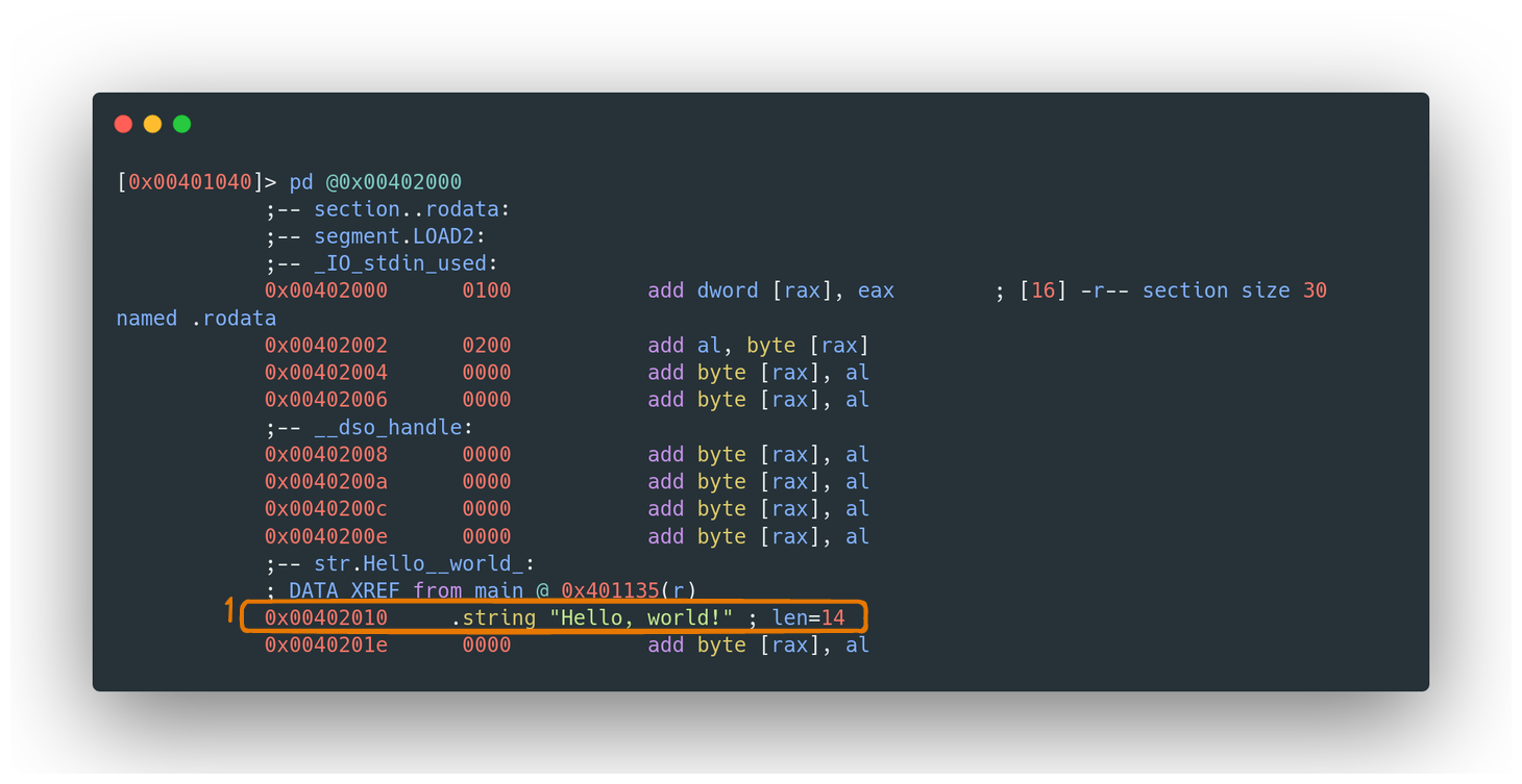 0 0x00002010 0x00402010 13 14 .rodata ascii Hello, world!