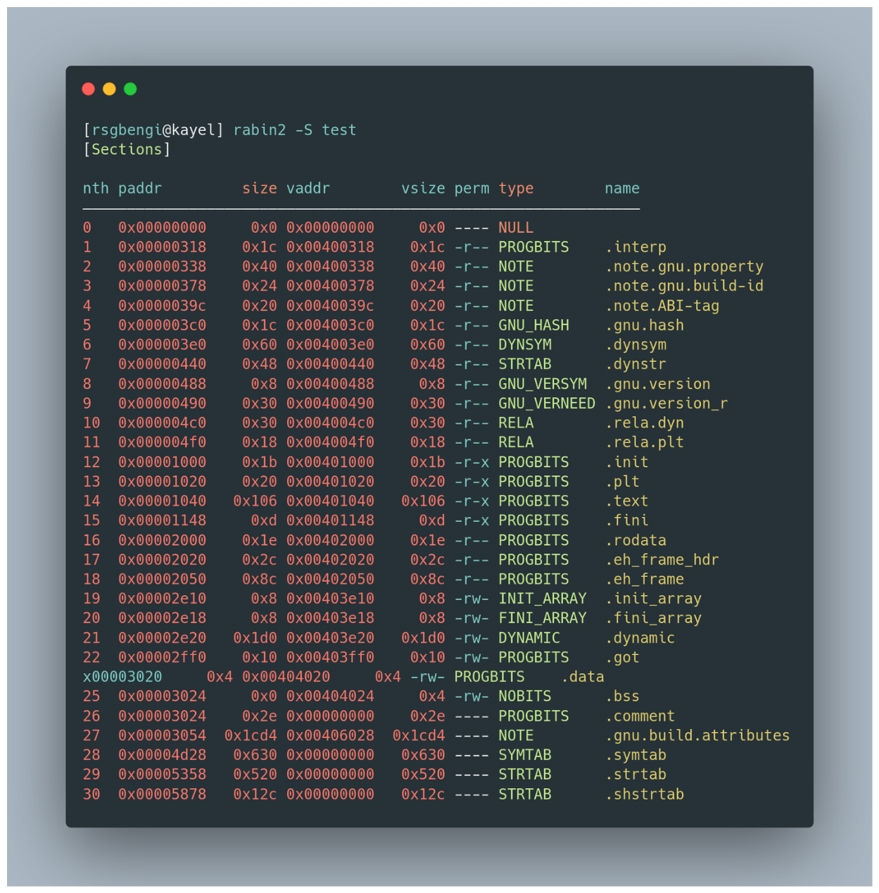 rabin2 -S testoriSwithin radare2 can provide detailed information about these sections. - Permissions in Sections: When analyzing sections, you’ll encounter various permissions: