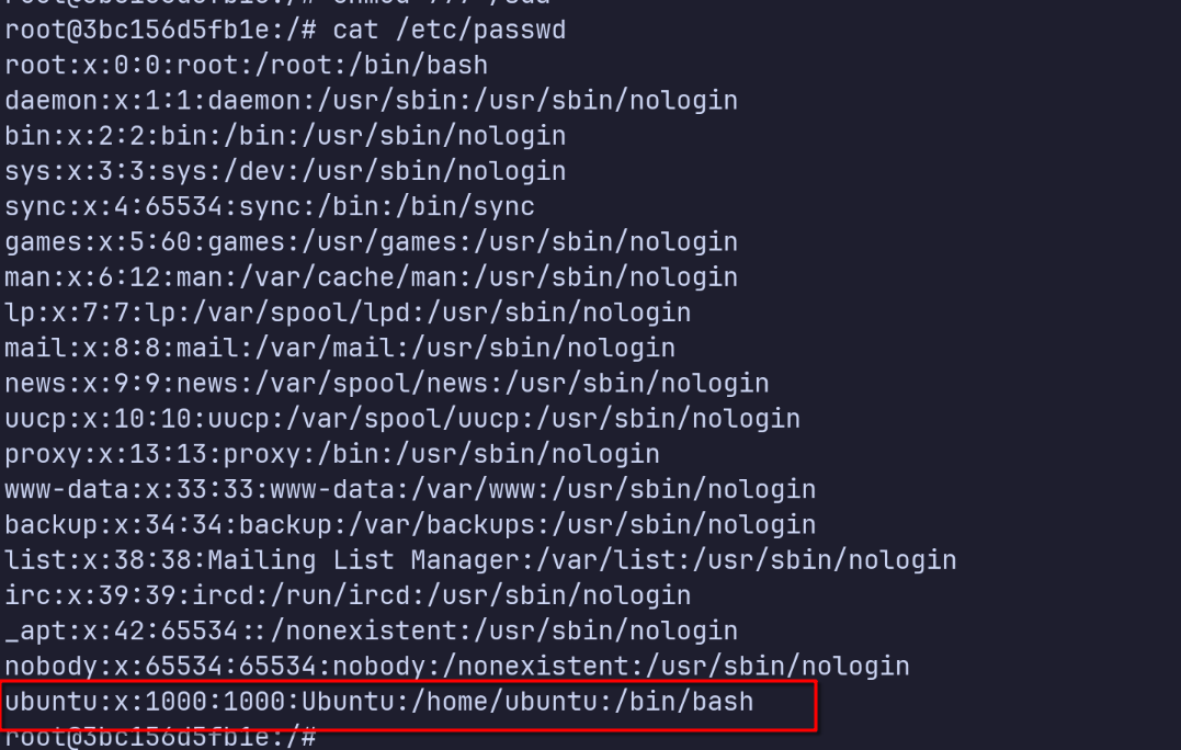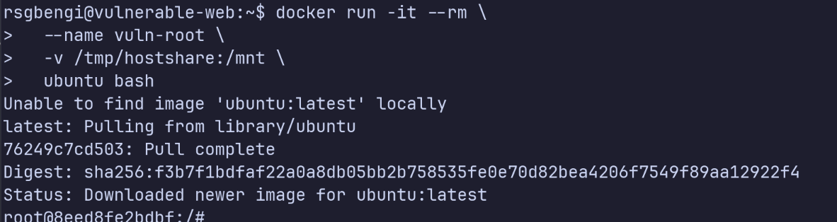 We then launch a new Ubuntu container. Since Docker defaults to running as root, and we mount our host directory into /mnt, we have both conditions satisfied:
