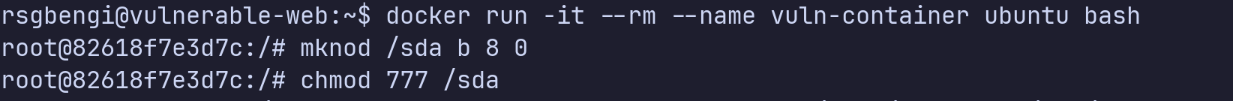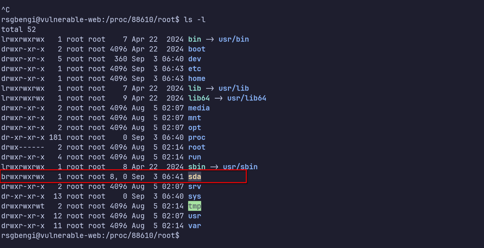 Now /sda exists inside the container and points directly to /dev/sda on the host. The wide-open permissions mean anyone can access it.