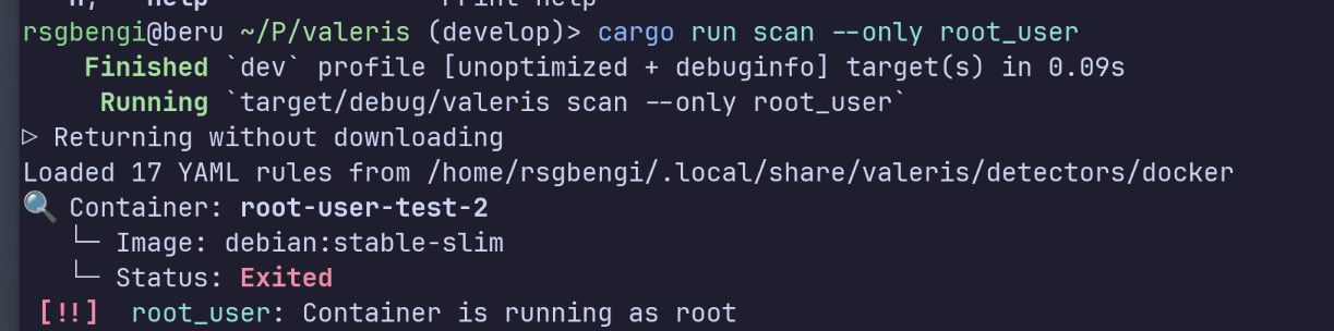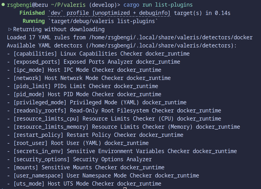 Right now Valeris is still in a very early stage. It only supports a handful of detectors, but the foundation is solid. Because checks are defined in YAML and powered by the Docker runtime API, adding new ones is as simple as writing another small rule.