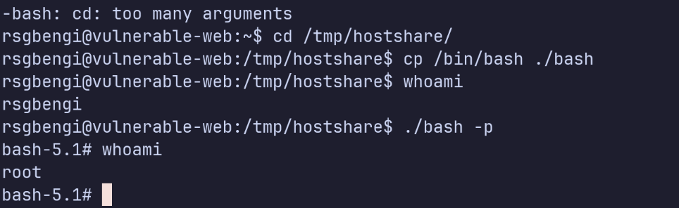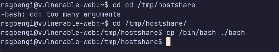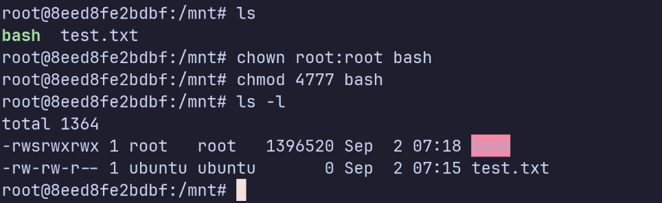 With root privileges inside the container, we copy the bash binary into the shared folder, then change its ownership and set the SUID bit: