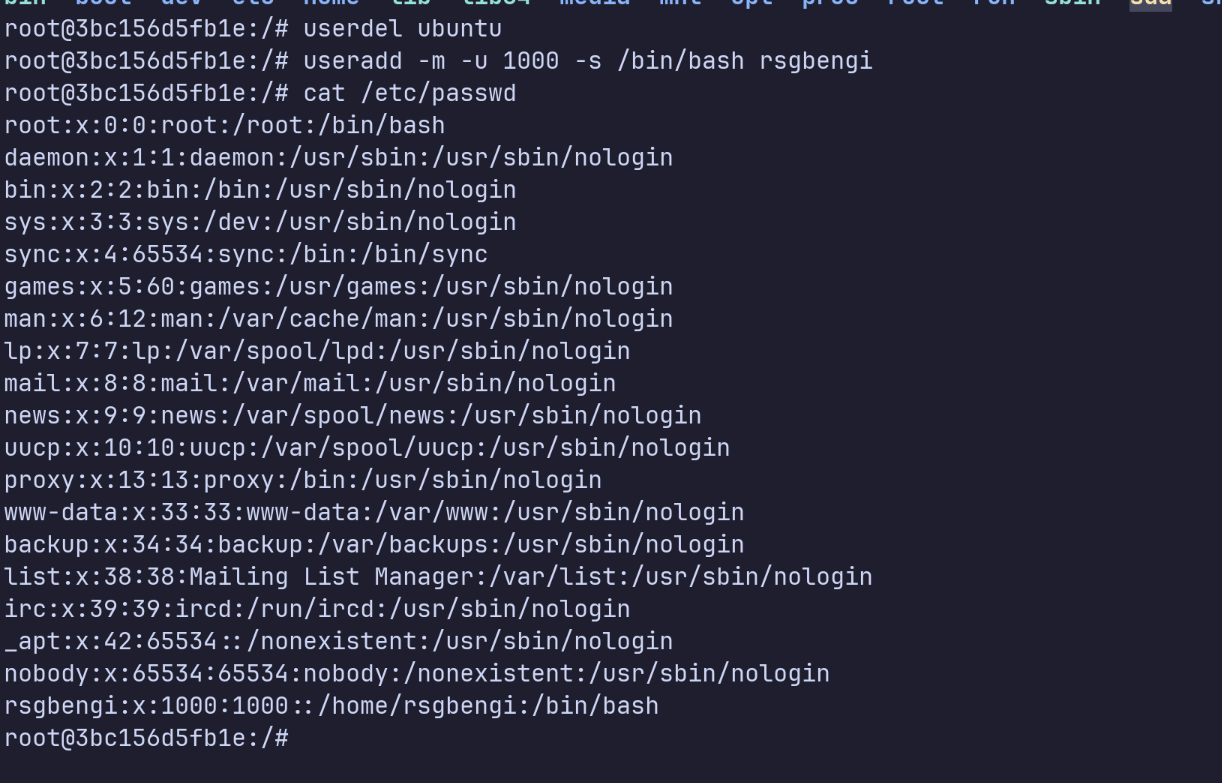 Next, we create a user inside the container that mirrors a real host user. In this case, the host has a user rsgbengi with UID 1000. So inside the container: