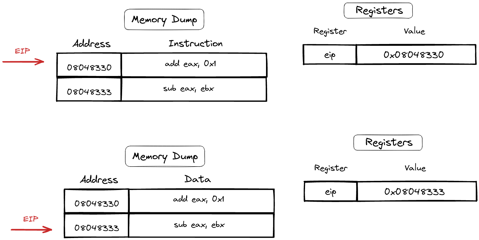 Letâs break it down with an example: consider the instruction âadd eax, 0x1,â a snippet of elegance stored in memory as â83 C0 01,â occupying a humble 3 bytes. Post-execution, the Instruction Pointer steps forward by 3, gracefully guiding the processor to the next act in this computational ballet. Itâs a dance of bytes and pointers, choreographed by the rhythm of instructions.