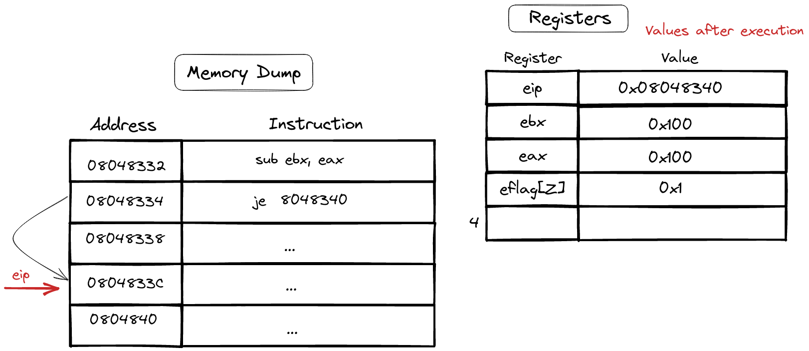 One star among these flags is the âzero flag,â a prominent player in the drama of equality. When an operation results in 0âsay, a subtraction in âsub ebx, eaxââthe zero flag takes center stage, setting itself to 1. Enter the âjeâ instruction, which keenly observes this flag. If the subtraction yields equality (zero flag set to 1), âjeâ gracefully takes its cue, changing the instruction pointer to the memory address it signifies.
